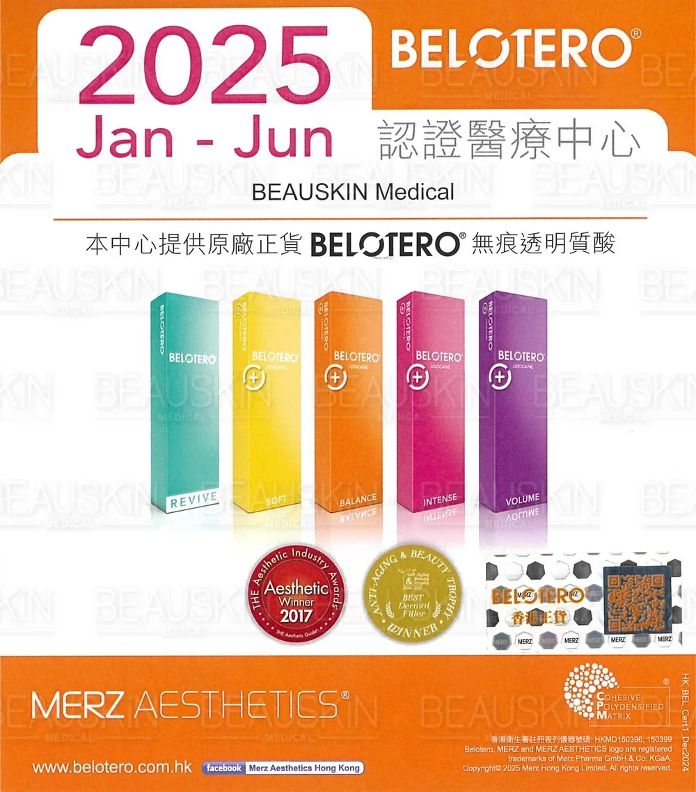BELOTERO® 透明質酸由瑞士製造,獲美國食品及藥物管理局FDA及歐盟CE認證,採用獨有專利多密度凝聚 (CPM®) 技術,具有良好凝聚度、彈性及可塑性,與皮膚融合度高,效果自然。