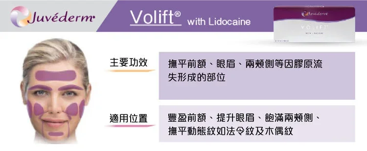 | Volift® 填補膠原流失,撫平凹陷 適用於:前額、眼眉、兩頰側 |