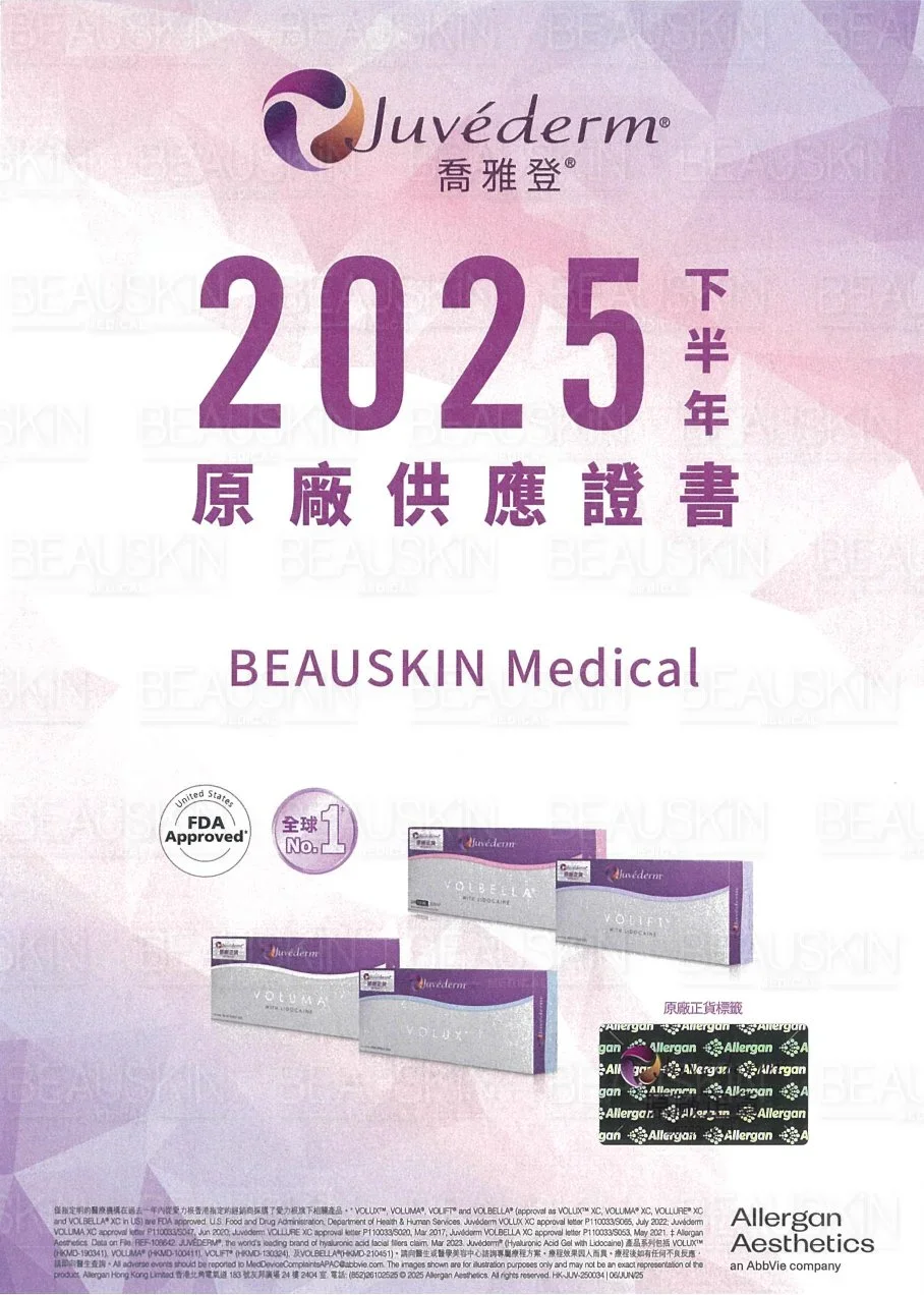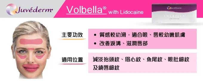 JUVÉDERM® 樣屬非動物穩定性透明質酸 ,可被身體完全吸收,產品以幼滑凝膠結合減痛Lidocaine而成,有效直接撫平臉上皺紋,修飾及締造持久自然輪廓,令面容更年輕。