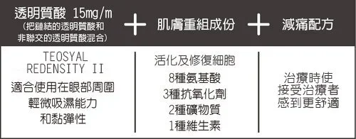 TEOSYAL® Redensity系列透明質酸是針對真皮層皮膚保養的治療。配方採用人體可自然分解及吸收的高比例、高濃度透明質酸,結合多達8種胺基酸、3 種抗氧化物、2 種礦物質及 1 種維生素的專利配方「皮膚重建精華」( Demo-Restructuring Complex 8,3,2,1) 而成。